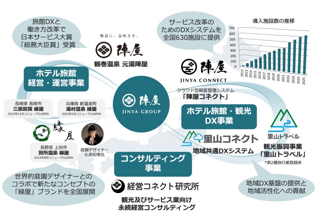 クラウド型旅館管理システム「陣屋コネクト」の開発・販売をはじめ、 新たな地域共有のDXシステム「里山コネクト」事業など、 日本全国の旅館の経営改革と地方創生に貢献する事業を幅広く展開しています。