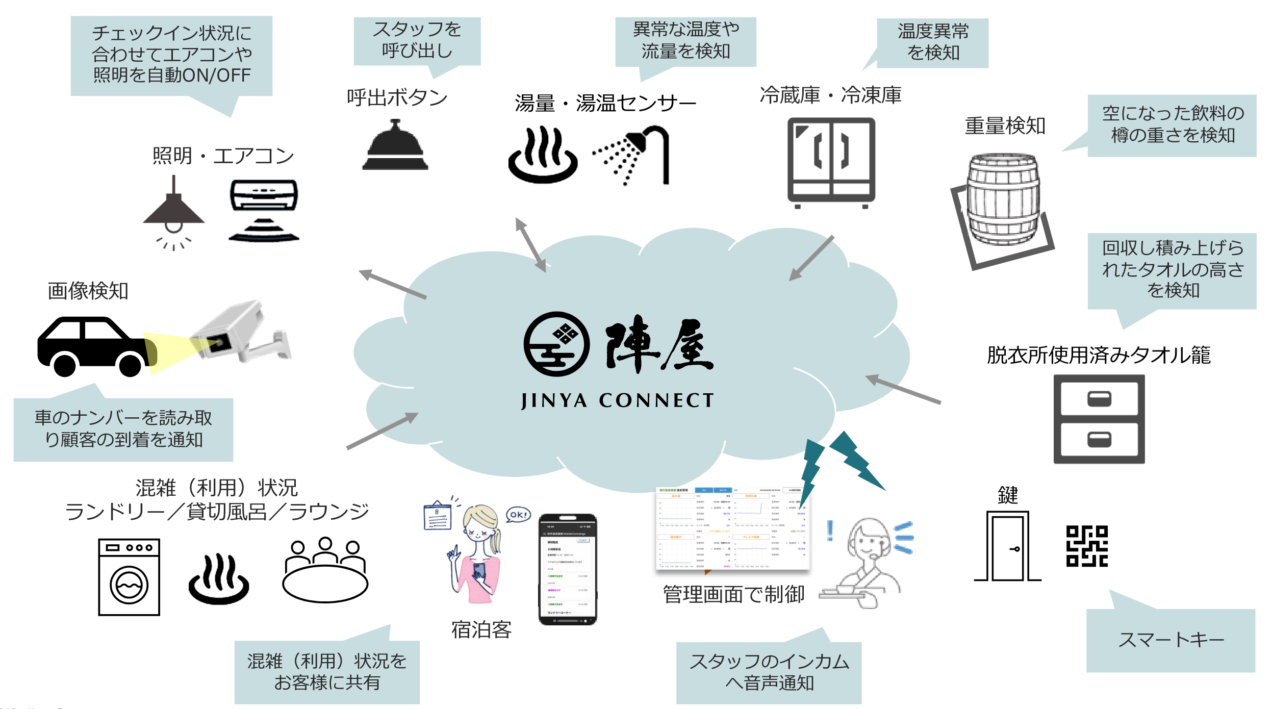 センサーや計測機器を陣屋コネクトに接続することで、作業効率化と光熱費の削減を実現します。温泉の湯温や湯量、浴室のタオル回収状況、ランドリーや温泉の混雑状況、冷蔵庫・冷凍庫の温度などさまざまな状況を可視化します。