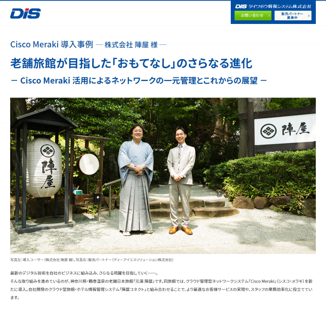 最新のデジタル技術を自社のビジネスに組み込み、さらなる飛躍を目指していく――。 そんな取り組みを進めているのが、神奈川県・鶴巻温泉の老舗日本旅館「元湯 陣屋」です。同旅館では、クラウド管理型ネットワークシステム「Cisco Meraki」(シスコ・メラキ)を新たに導入。自社開発のクラウド型旅館・ホテル情報管理システム「陣屋コネクト」と組み合わせることで、より最適なお客様サービスの実現や、スタッフの業務効率化に役立てています。