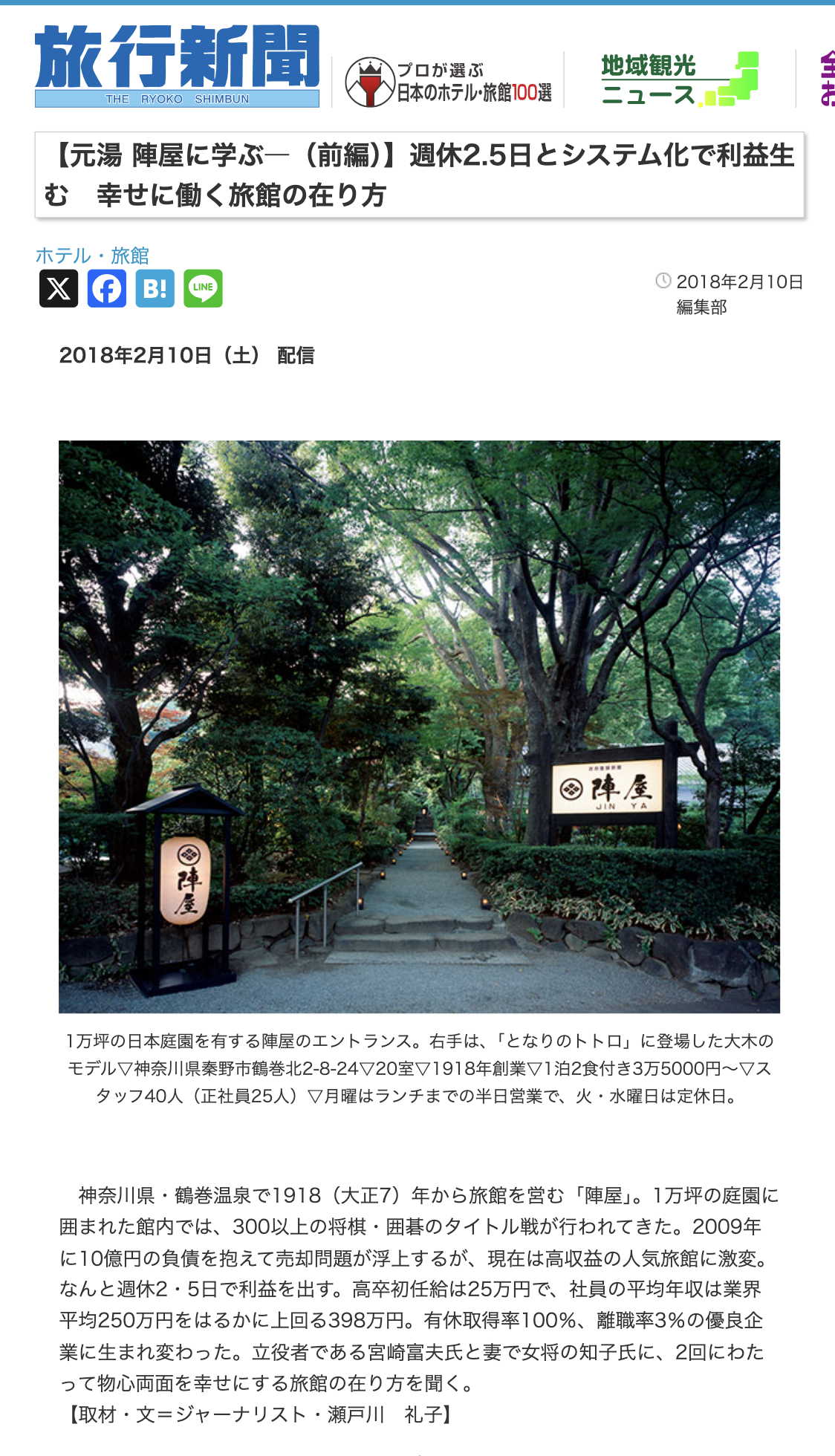 神奈川県・鶴巻温泉で1918(大正7)年から旅館を営む「陣屋」。1万坪の庭園に囲まれた館内では、300以上の将棋・囲碁のタイトル戦が行われてきた。2009年に10億円の負債を抱えて売却問題が浮上するが、現在は高収益の人気旅館に激変。なんと週休2・5日で利益を出す。高卒初任給は25万円で、社員の平均年収は業界平均250万円をはるかに上回る398万円。有休取得率100%、離職率3%の優良企業に生まれ変わった。