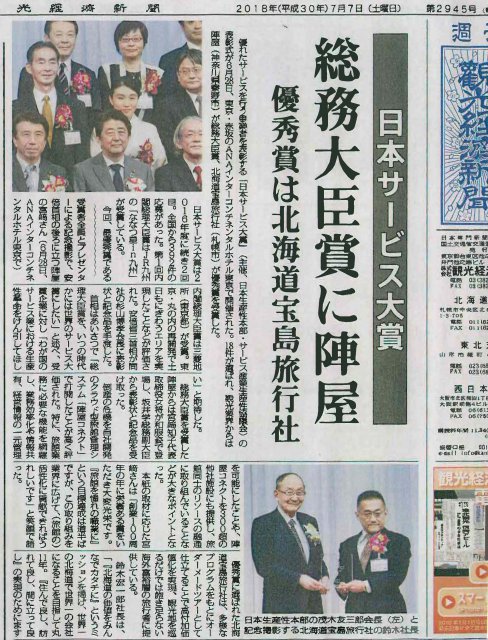 優秀賞優れたサービスを行う事業者を表彰する「日本サーピス大賞」(主催、日本生産性本部・サーピス産業生産性協議会)の表彰式が6月28日、東京・赤坂のANAインターコンチネンタルホテル東京で開催された。18件が選ばれ、観光業界からは陣屋(神奈川秦野市)が総務大臣賞、北海道宝島旅行社(札幌市)が受賞した。