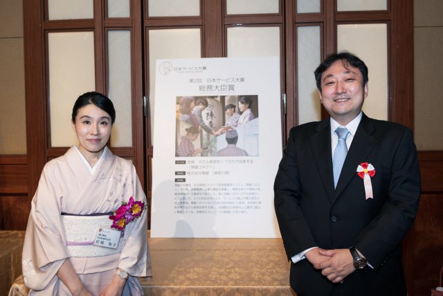 総務大臣賞を受賞した陣屋からは宮崎知子代表取締役女将が和服姿で登場し、坂井学総務副大臣から表彰状と記念品を受け取った。