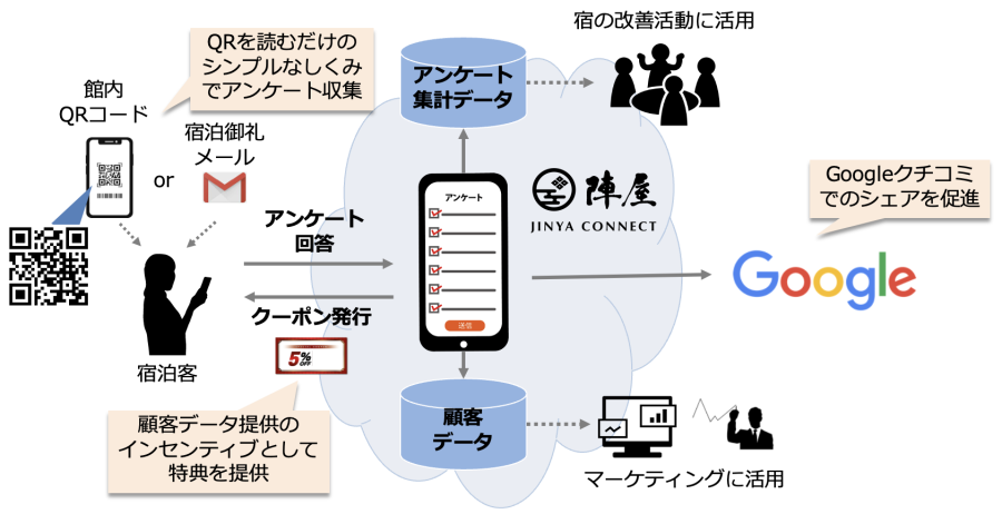お客様は、館内に設置されたQRコードを読み取るか、チェックアウトの時間に合わせて自動で送られるメールに記載されたURLからアンケート画面にアクセスして、アンケートに回答することができるため、アンケート回収に伴う施設スタッフの手間を省略することができます。