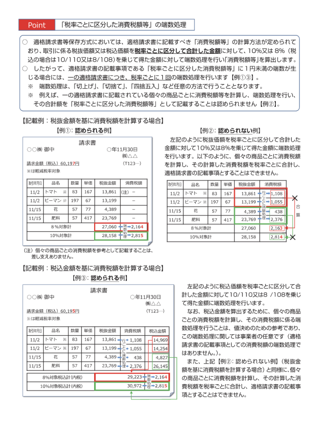 従来は細かい要件がありませんでしたが、インボイス制度が開始されると、インボイスごとに標準税率10%と軽減税率8%に分けて金額を集計後、税率ごとに消費税を計算し端数処理を行うことが必要となります。
