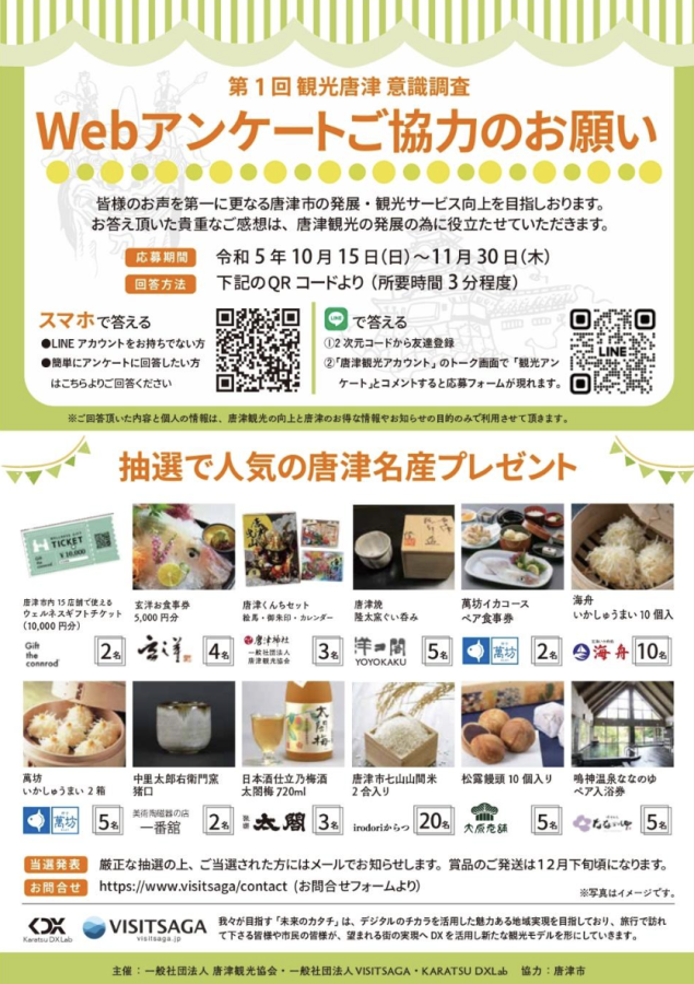 唐津市での取り組みは、VISITSAGAが主催し唐津観光協会と会員業者、唐津市観光文化課、KaratsuDXLab、WeDなどが新しい観光の連携のカタチで取組まれてお