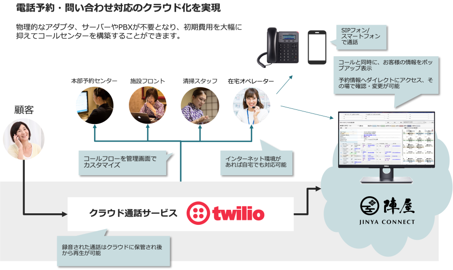 陣屋コネクトの新オプション「クラウドコールセンター機能」はインターネットを介してのコールセンター機能を実現します。物理的なコールセンター設備を持つ必要がなく、インターネット接続があればどこからでも利用可能です。