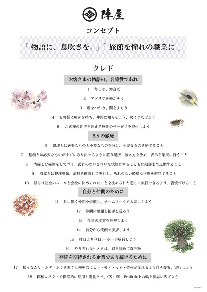 陣屋グループが目指しているのは、お客様に選ばれ、働く人が誇りを持ち、事業としても持続的に成長できる宿泊産業の姿です。私たちは、CS(顧客満足)、ES(従業員満足)、Profit(利益)のいずれか一つを優先するのではなく、この三つを同時に高めていくことこそが、旅館を「憧れの職業」にするために不可欠だと考えています。