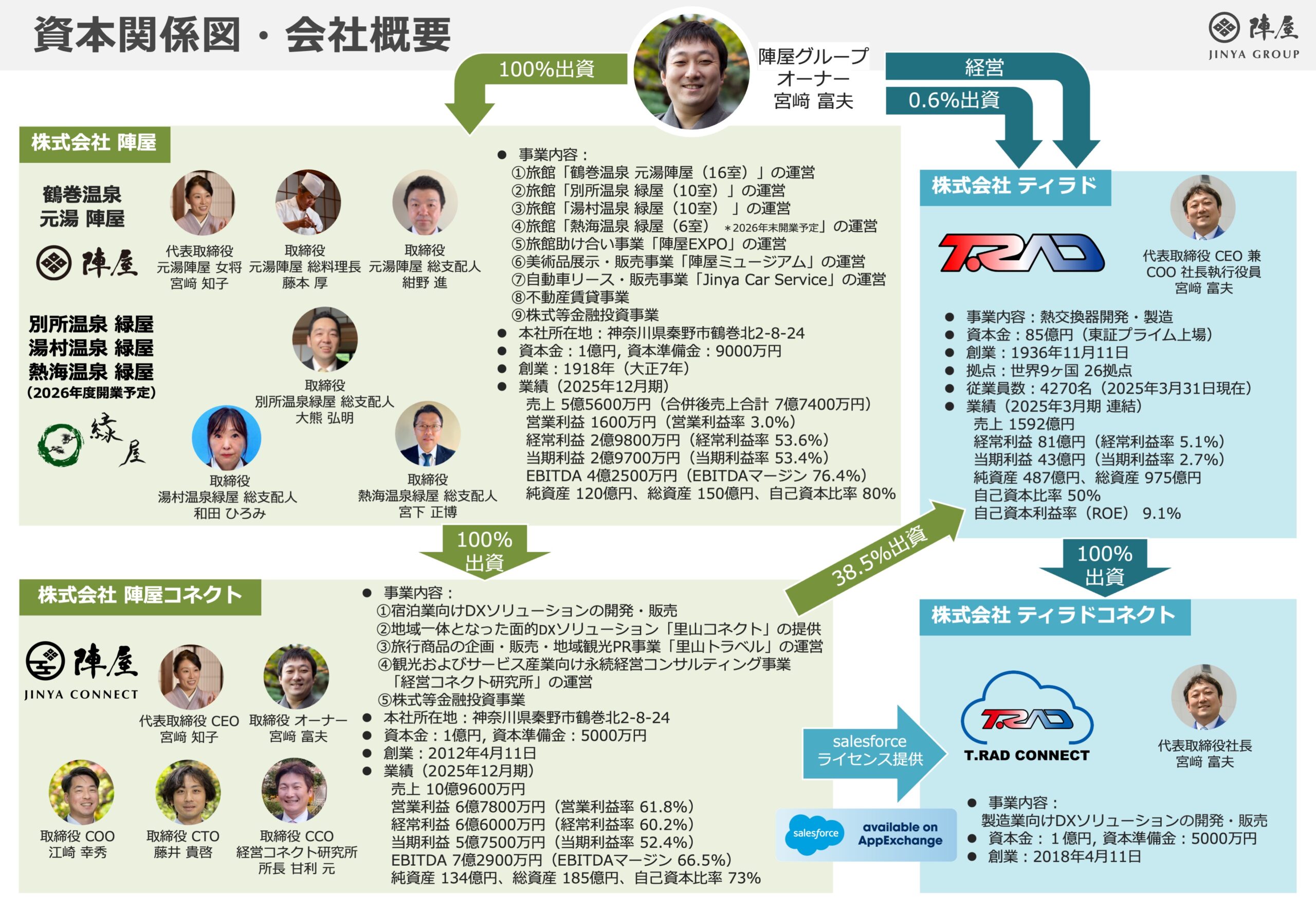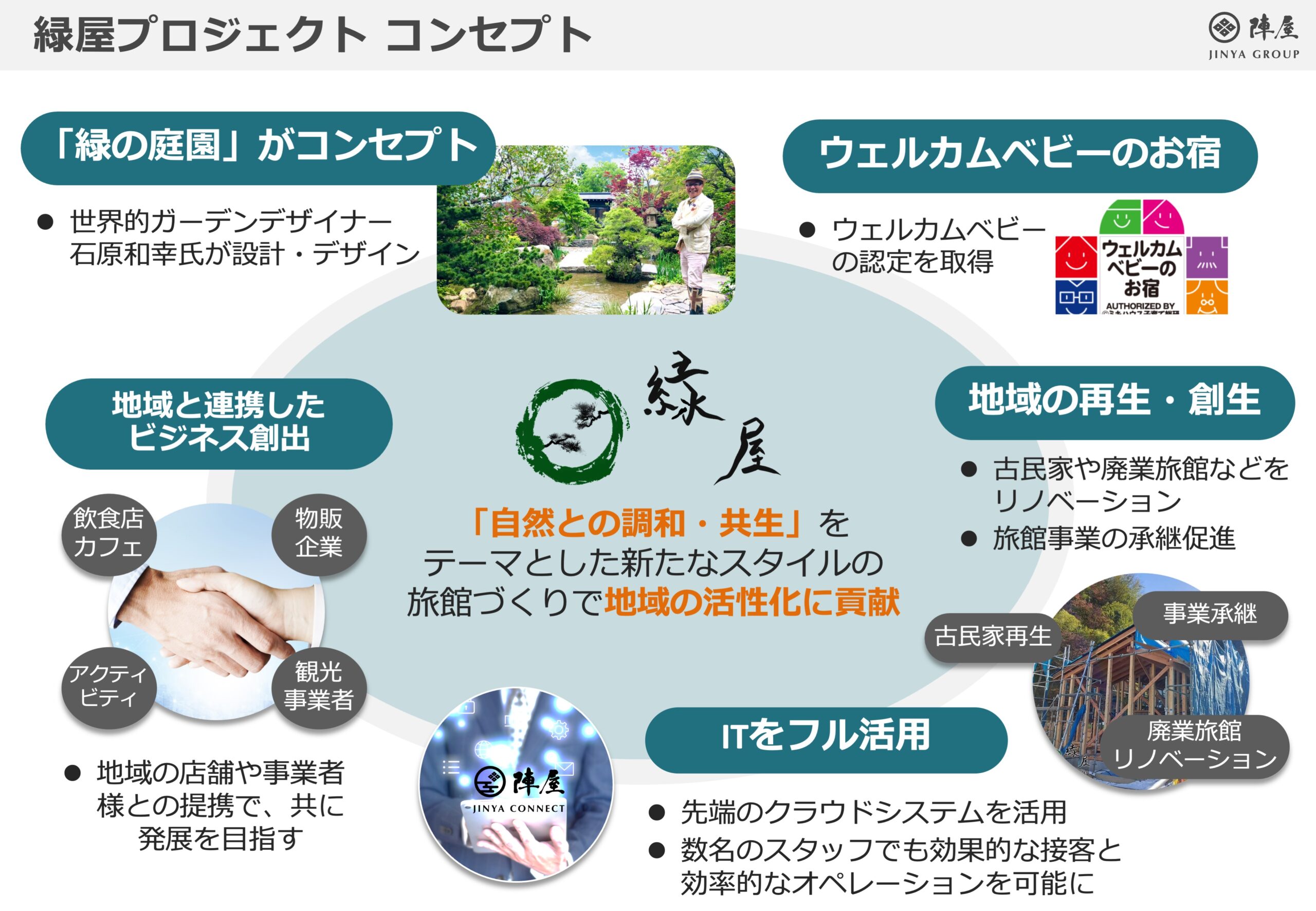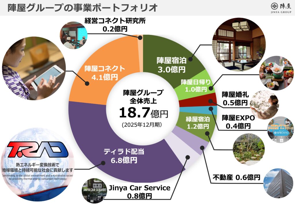 | 事業内容 | ①旅館「鶴巻温泉 元湯陣屋(16室)」の運営 ②旅館「別所温泉 緑屋(10室)」の運営 ③旅館「湯村温泉 緑屋(10室)」の運営 ④旅館「熱海温泉 緑屋(6室) *2026年度開業予定」の運営 ⑤旅館助け合い事業「陣屋EXPO」の運営 ⑥美術品展示・販売事業「陣屋ミュージアム」の運営 ⑦自動車リース・販売事業「Jinya Car Service」の運営 ⑧不動産賃貸事業 ⑨株式等金融投資事業 |