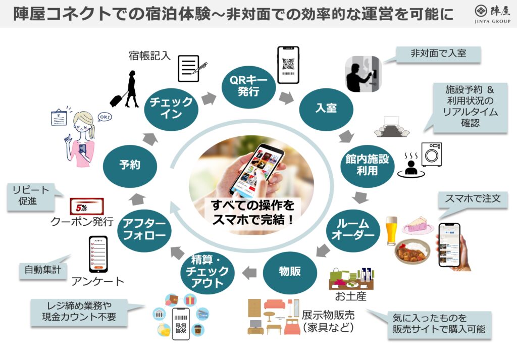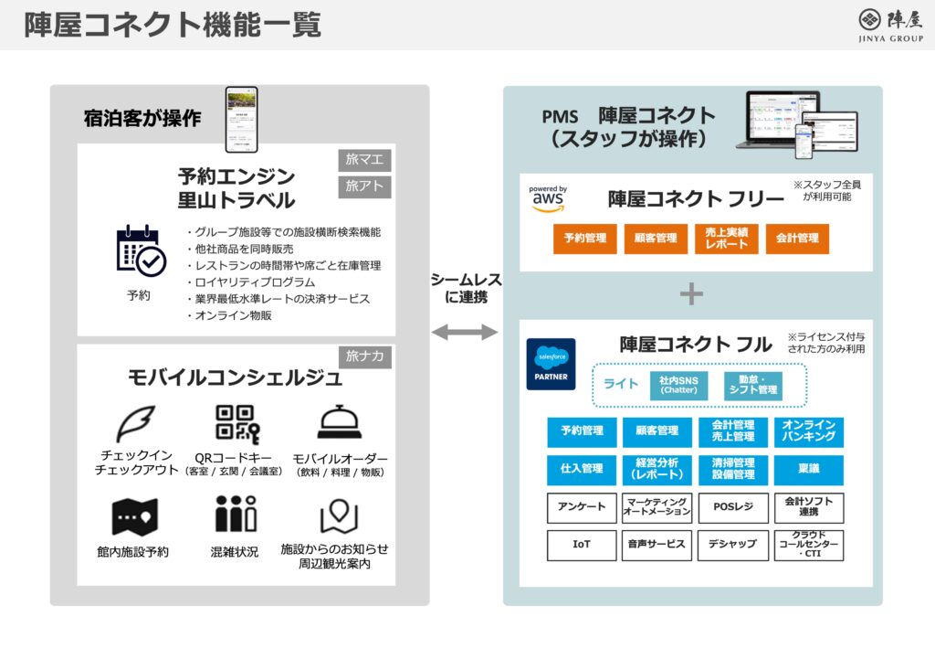 こうした現場課題を解決するために開発されたのが、クラウド型宿泊施設向け管理システム「陣屋コネクト」です。予約・顧客管理・会計・在庫・スタッフ管理などを一体化し、現在は全国630以上の宿泊施設で導入されています。非対面での効率的な運営を可能にする新機能(モバイルコンシェルジュ/里山トラベル/IoT連携)も開発し、お客様に新しい宿泊体験を提供しています。