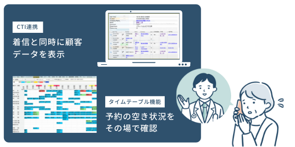 タイムテーブルでの予約管理により、時間ごとの場所管理と患者様情報が一目で確認できるようになるため、次回予約時の空き状況をその場で確認できるようになり、患者様をお待たせするとこなく、満足度向上につながります。
