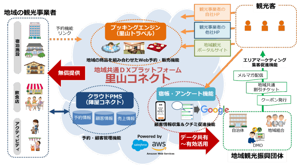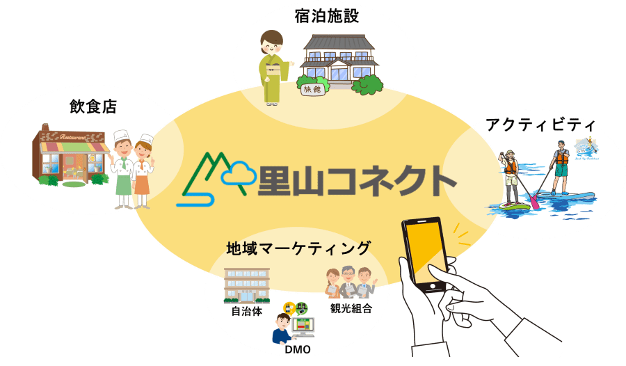 陣屋コネクトで培った革新的なIT技術をベースに、地域全体でマーケティング・集客強化とDXを推進するための地域観光DXプラットフォーム「里山コネクト」 を提供いたします。