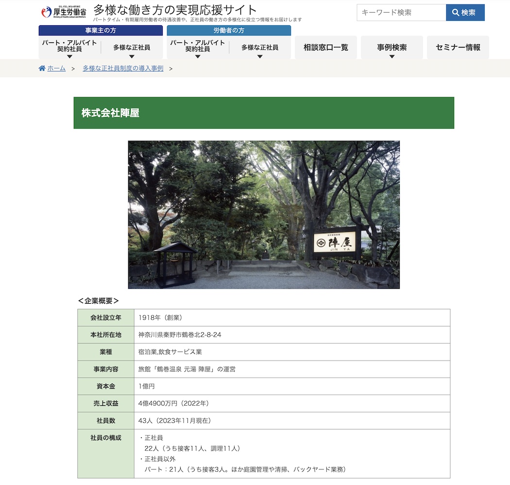 厚生労働省 多様な働き方の実現応援サイトに掲載されました 2026 1/25 WEBメディア 2024年5月30日 厚生労働省「多様な働き方の実現応援サイト」の事例紹介。株式会社陣屋が、厚生労働省の「多様な働き方の実現応援サイト」にて、多様な正社員制度の導入事例として掲載されました。陣屋は、旅館業のDX化(陣屋コネクト)に加え、多様な働き方を通じて働きがいのある職場作りを実現しています。 詳細を見る Topics一覧に戻る 最新のトピックス 2025年11月19日 社長名鑑に掲載されました 2025年8月12日 地域共通DXシステム「里山コネクト」新登場 2025年2月1日 PHPビジネスTHE21に掲載されました WEBメディア 「Precious.jp」に掲載されました JEED -エルダー8月号 に掲載されました